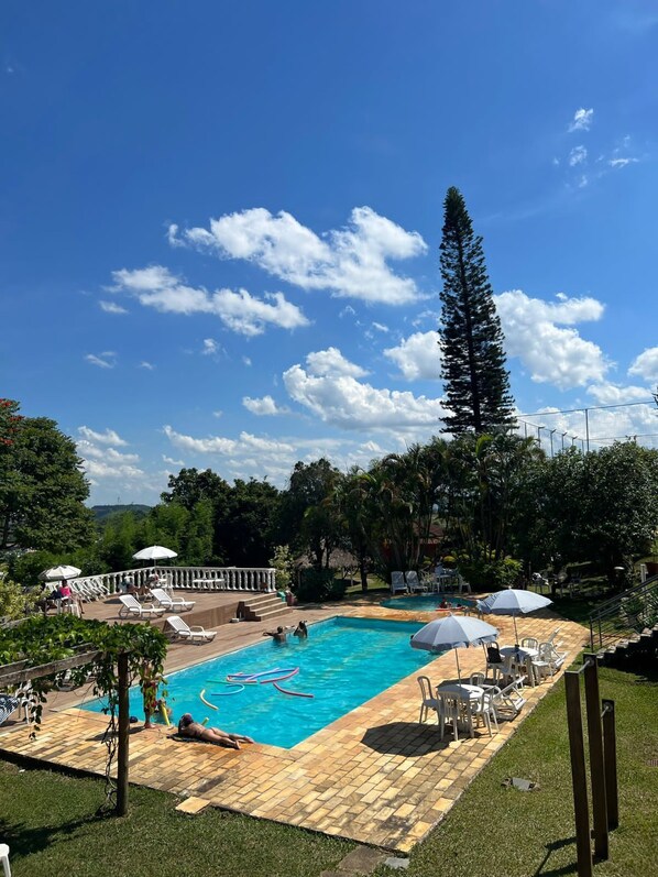 Garden views frame this peaceful retreat where travelers can splash in the outdoor pool or challenge each other to games suitable for every generation