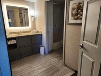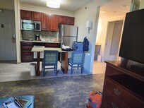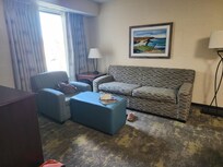 The suite was decent - had a living room with a closet, a nice little kitchenette with a fridge, a decent-sized bathroom, and the bedroom was pretty nice, with a large closet. The hotel was in a good location, not directly on the street, but set back a little, so we didn't have any street noise. A balcony would have been appreciated, also the main doors to the other units were loud. So if not for the A/C running, we'd have been woken up by the slamming of the heavy doors. Also, some people might be concerned about some of the minor wear and tear in the rooms that comes with normal aging. But I heard some staff saying they would be renovating next year, so I hope that will be remedied. The breakfast area was large, and the choices were okay, not always very hot. We would stay again because we loved the suite. Oh, and the worst thing, IMO, was the lack of TV choices. There were two TV's, one in the living room and one in the bedroom, which was good. But very few channels, and they were so very awful. And no chance of streaming anything, there were no options there. The desk people were nice and friendly. This review is for the Williamsburg, VA location.