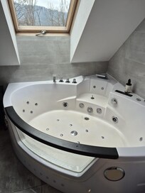The jacuzzi is massive – easily fits two people comfortably with room to spare.