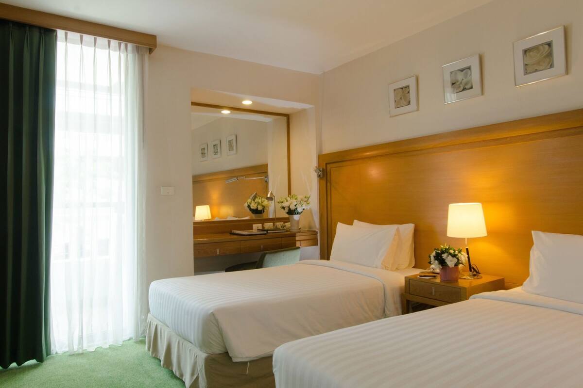 Bangkok's urban retreat where travelers can recharge in a sauna, lounge by the pool with sun loungers, and enjoy authentic Thai cuisine between sightseeing