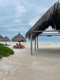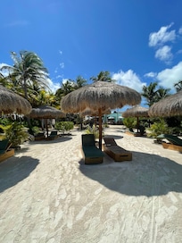 Literie très confortable, plage devant l'hôtel avec service et plusieurs Palapas.
