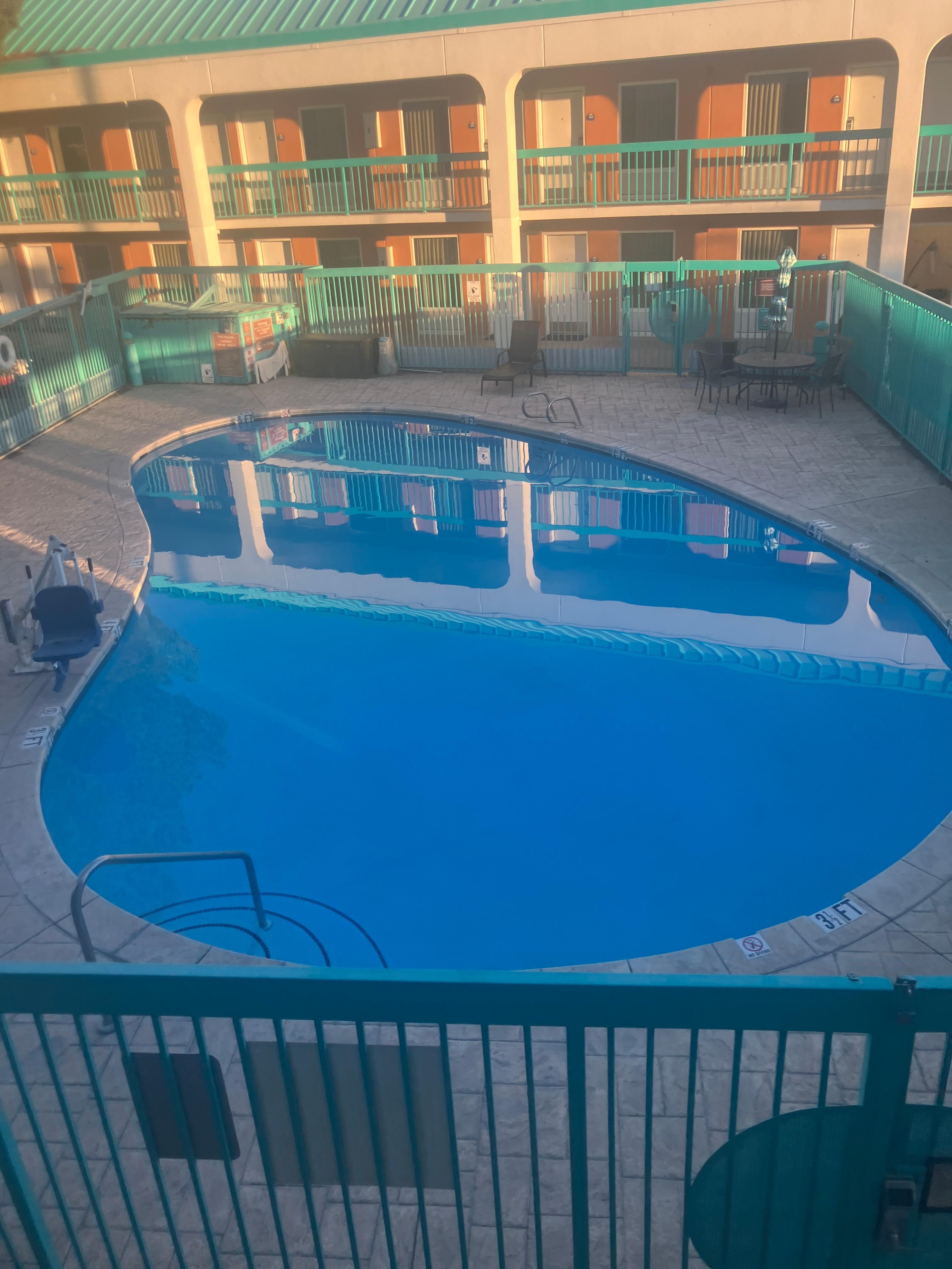 The room and property felt safe, was clean, the bed was comfortable. We were disappointed to not have coffee in the room as expected, but it got us out the door and on the road so we could grab some. We’d requested ground floor and the place was fairly empty when we checked in, but ended up having to get our bags up the stairs, anyway. Before dark, the parking lot was fairly full with some moving trailers backed across several spots. At least the stairs weren’t overly steep and we did manage on our own.