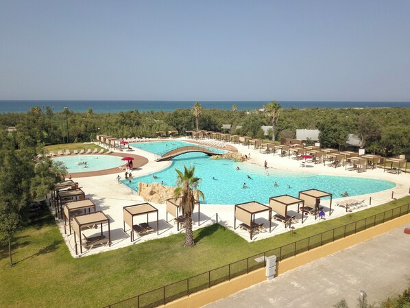 Kolam renang terbuka bermusim dan kolam kanak-kanak, bersama dengan kerusi lepak pantai