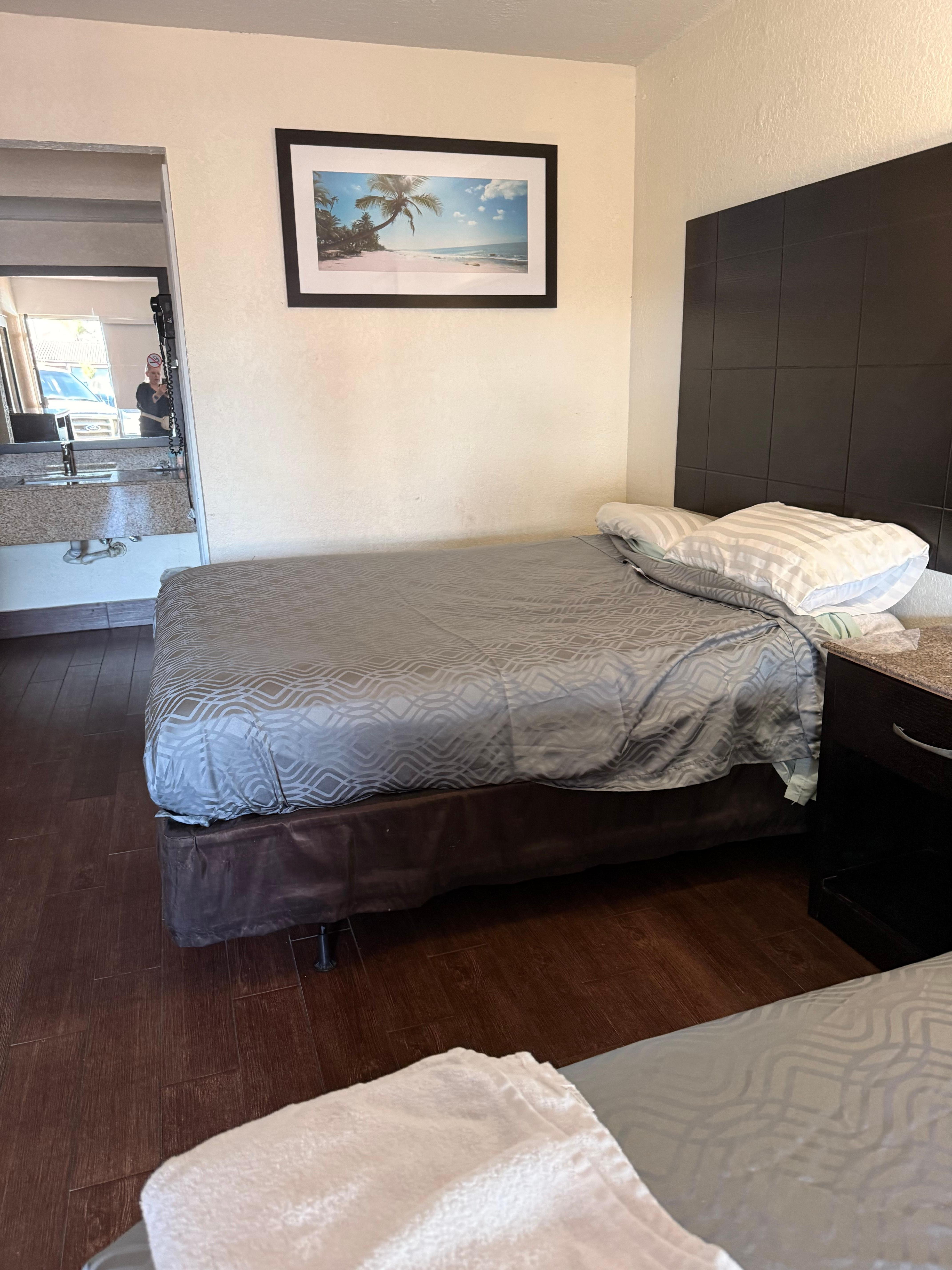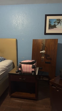 I’ll start with the positives air-conditioning was nice and cold in the room and there was hot water. The beds for very saggy pillows were lumpy ironing board was disgusting with stains all over it. Furniture was broken. George didn’t work. A lot of long-term residency seem to be living at the hotel broken down cars in the parking lot. The hotel lobby was closed so nothing like the pictures no continental breakfast nothing the ice machine did work. The pool was only half full of water and closed down.