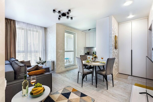 Penginapan tamu di pangsapuri ini ada menawarkan seterika/papan seterika dan langsir/tirai gelap terus. Televisyen skrin rata 40-inci disertakan dengan saluran kabel.Pangsapuri di Minsk menyediakan akses Internet wayarles percuma, dengan kelajuan Wi-fi 500+ Mbps (sesuai untuk 6+ orang atau 10+ peranti).