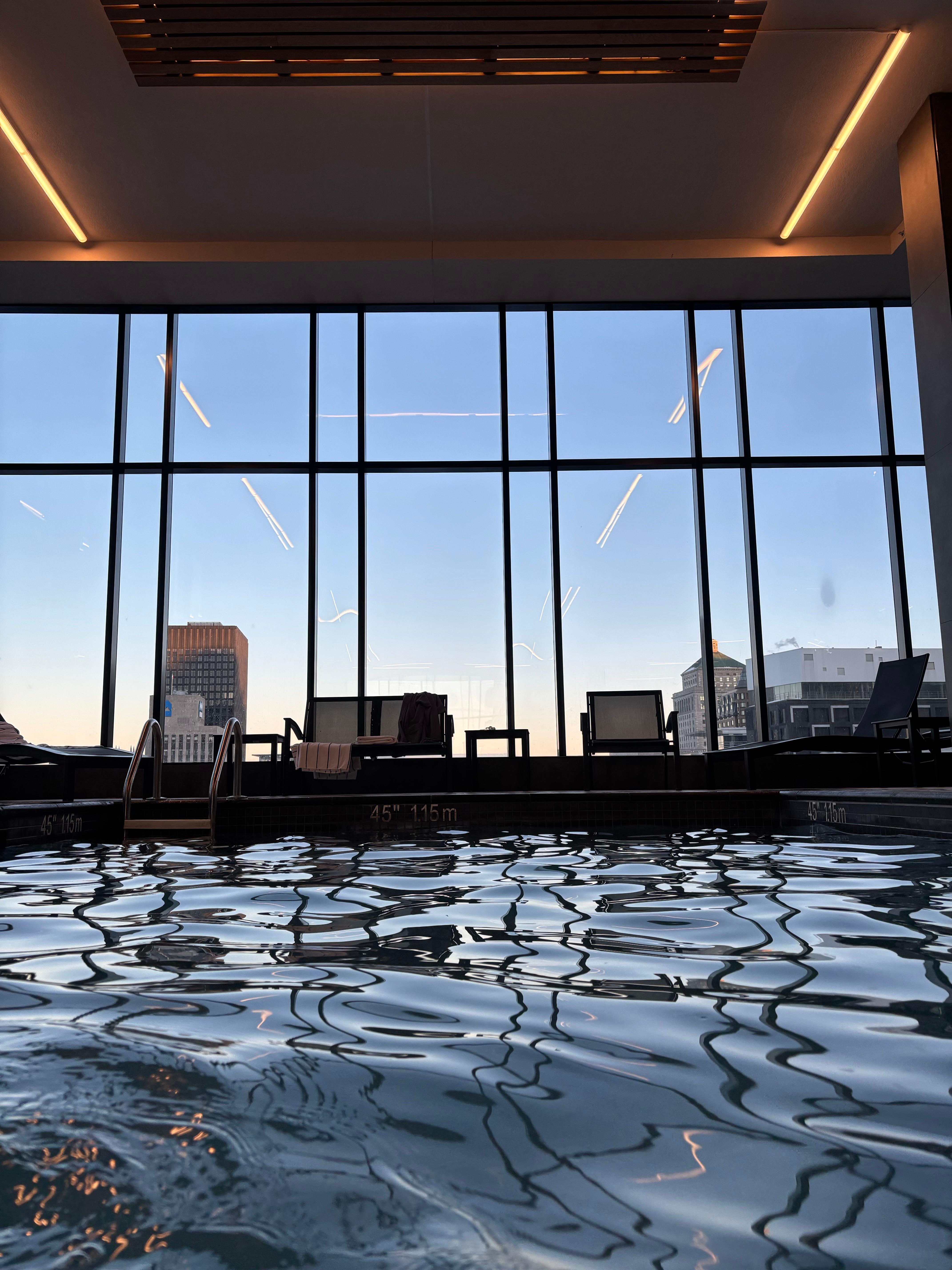 Upscale Montreal retreat featuring an indoor pool, spa tub and sauna where travelers can relax before enjoying Mediterranean cuisine at La Palma restaurant