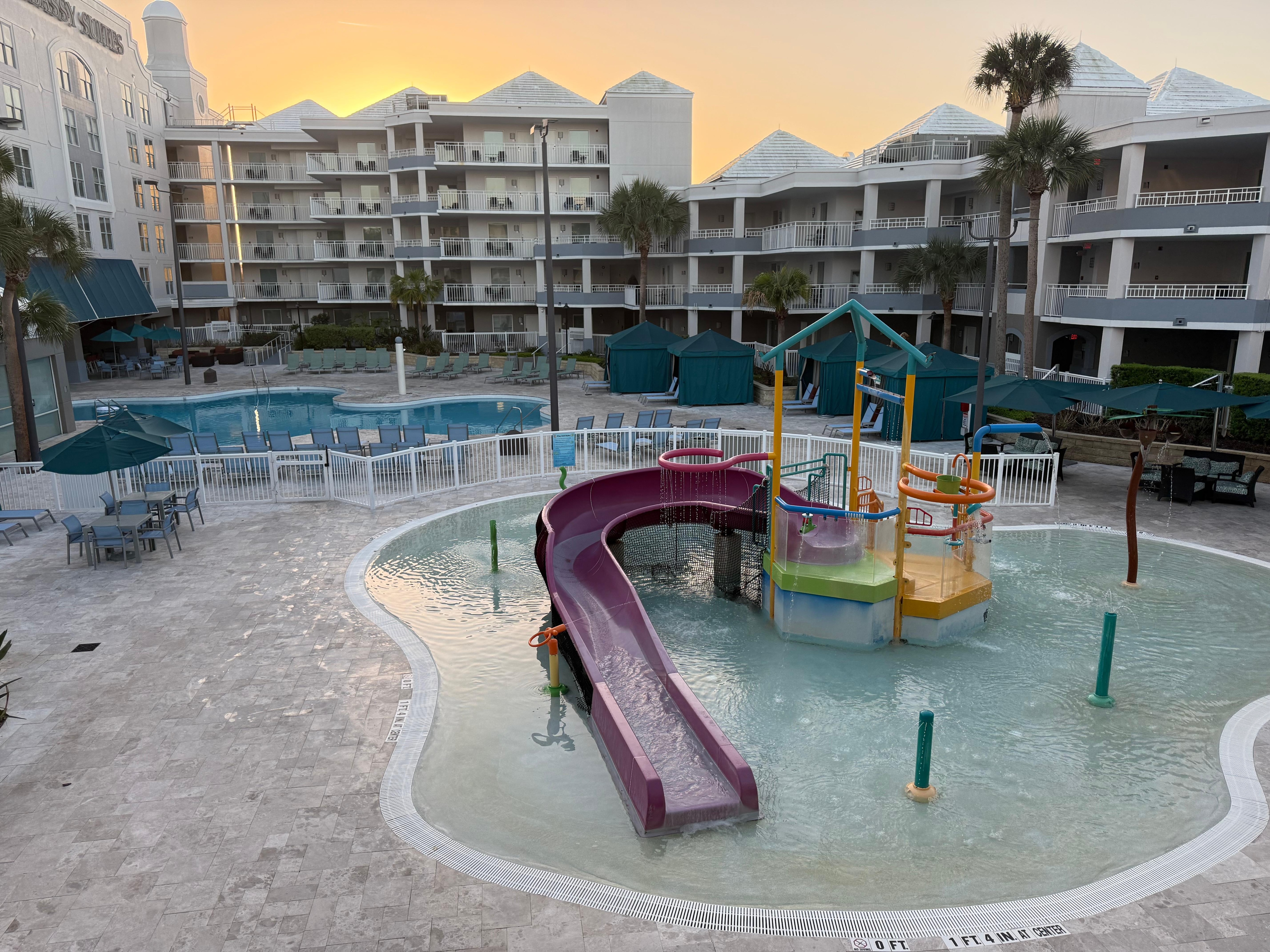They have a free breakfast buffet, omelette, station, and Mickey Mouse waffles… Juice, milk, coffee… Everything is free… Indoor heated pool which connects to the outdoor pool… My four-year-old had a great time… However, the little water park with a slide area they had, was freezing, and the slide was falling apart rocking back-and-forth and the water wouldn’t even push my four-year-old down. They do have cornhole, Jenga, playground, volleyball, four hole, putting green, & pool table.. they clean your room every day, change out your towels, make your bed, etc.… Their pool towels are crappy, super small and very thin… I suggest you bring your own pool towels… We had a room with a lanai facing the pool, which was great because we just went out the gate into the pool area…