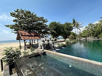Hotel Tugu Lombok offers a tropical retreat with a private beach for sun-soaked relaxation. Guests can enjoy hydrotherapy at the spa, dine at Bale Kokok Pletok, and splash in indoor and outdoor pools with a waterslide. Families particularly appreciate the welcoming atmosphere.