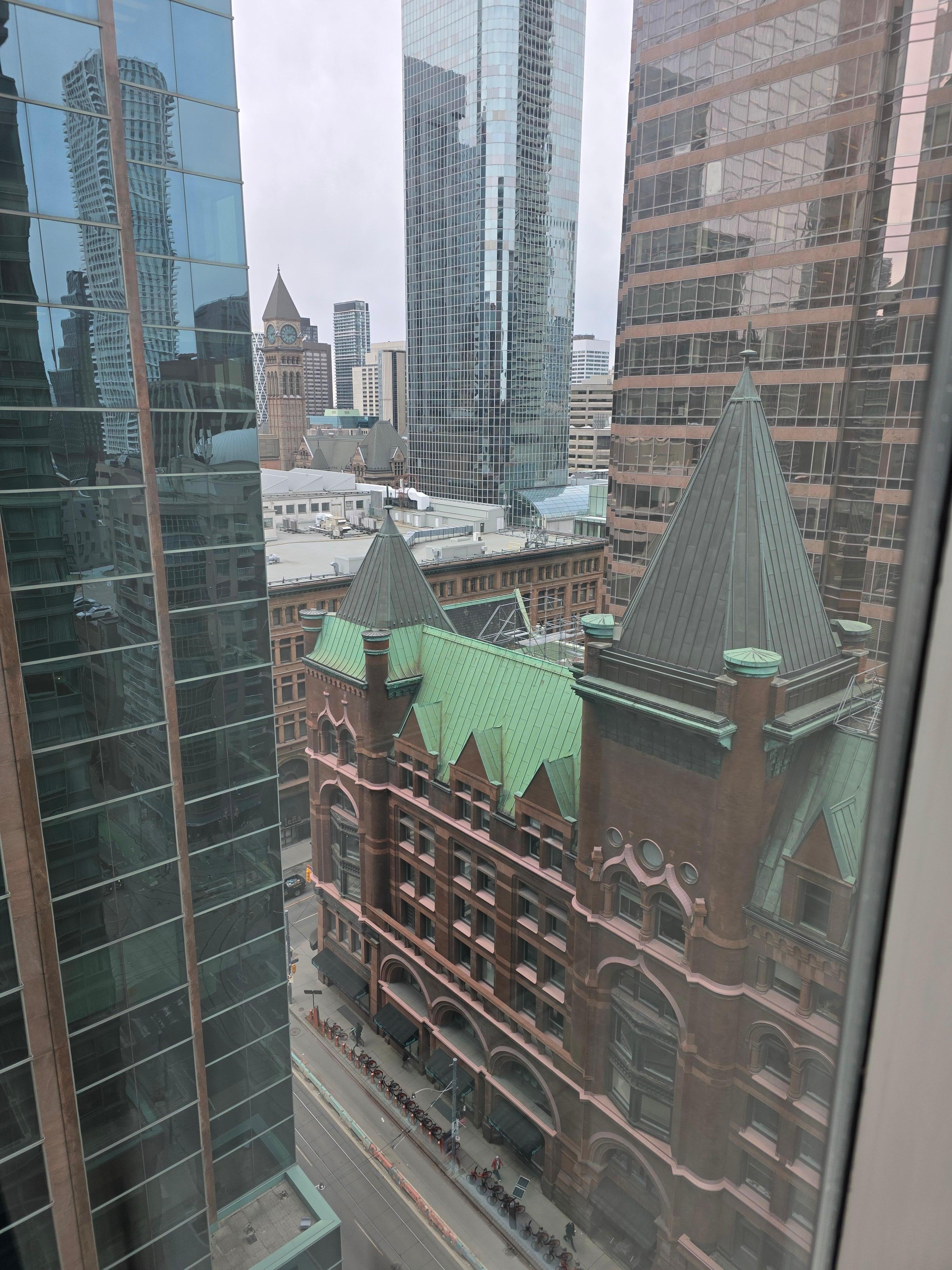 Clean & spacious room good for families. The king bed is very comfy but only found 1 outlet by the bed for charging phones. I stayed on 14th floor and the corridors smell like vinegar. Location is quiet within walking distance to Massey Hall, Eaton Centre & Union station. Main lobby entrance is a bit hidden and hard to find if you are new to the area. My room was not ready until 4:22 pm and the keys were not working so I had to bring back to the front desk for a reset. Room has a complimentary coffee maker but no kettle for boiling water. Shower pressure is good! Overall, pleasant stay for this price range, location and space with just minor issues.