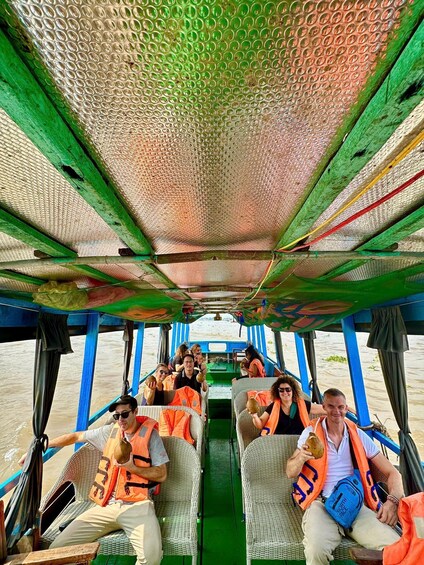 Continue with a boat cruise on the Mekong River, passing floating houses and fish cages that reflect daily river life. Transfer to a small hand-rowing boat and glide through peaceful canals shaded by coconut trees, offering an authentic glimpse of local village life.