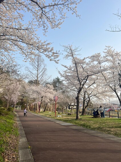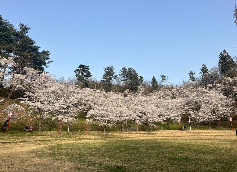 The next stop is the view spot on top of Inaniwa castle. Enjoy the view of the castle perched on top of the mountain and the countryside. Lunch will be udon noodle, a specialty of this area. After that, visit Maemori Park. About 180 Someiyoshino cherry trees and 20 double-flowered cherry trees are planted here, and it is a popular place for local people to relax and enjoy a pleasant moment in the gentle breeze. The tour will end at Yuzawa Station.