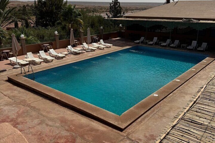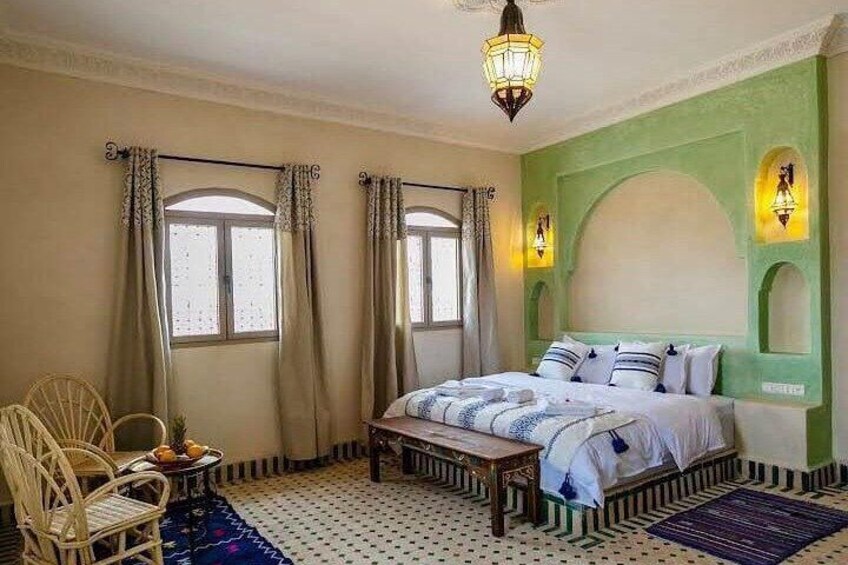 Free half day in the hotel, you can enjoy the pool. In the afternoon, the driver will pick you up heading to the camp then you exchange vehicles for camels and commence an exhilarating adventure across the vast sand dunes of Erg Chebbi, culminating in witnessing one of the most stunning sunsets imaginable. Spend the night in al luxury desert camp beneath nomadic tents, immersed in the tranquility of the desert.