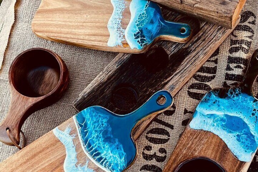 Resin coaster class - make 4 handmade coaster with epoxy resin. We are a creative studio where you can learn how to use, mix and blend epoxy resin on wood.