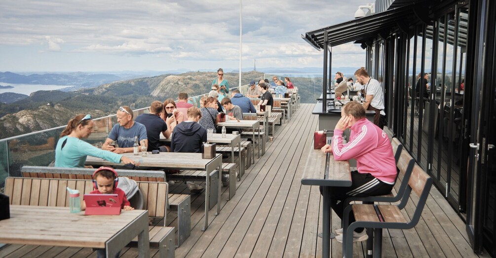 Indoors, Ulriken Café serves hot and cold Norwegian dishes, while Skyskraperen Restaurant offers a refined 3-course lunch and 5-course dinner experience.