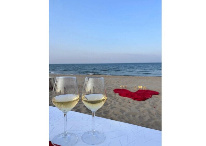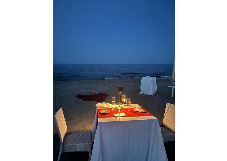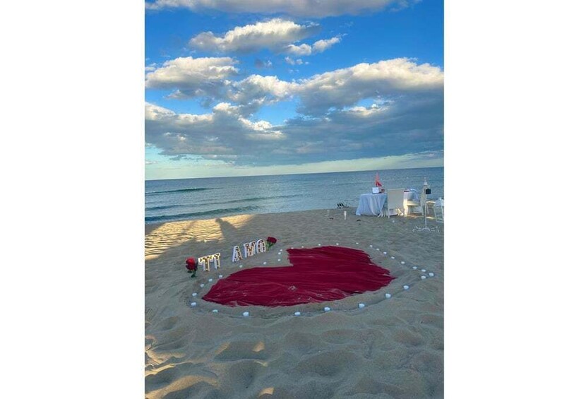 We've got a romantic setup just for you, with a table on a platform by the sea or on the beach, candles and rose petals all around, a personalized dedication in a frame on the table, a path of lanterns, rose petals, and a white/red carpet leading to the table, a heart and 'I love you' in bright letters, and background music.