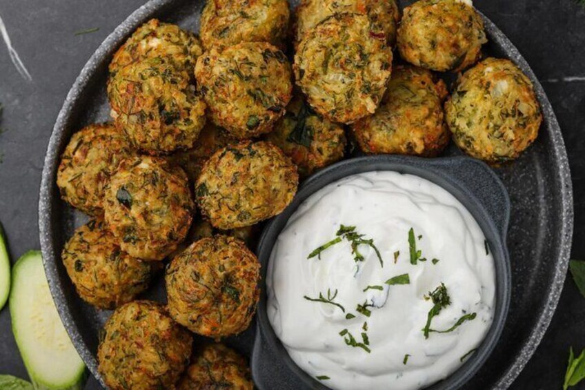 • Third course: Golden vegetable fritters with creamy yogurt dip