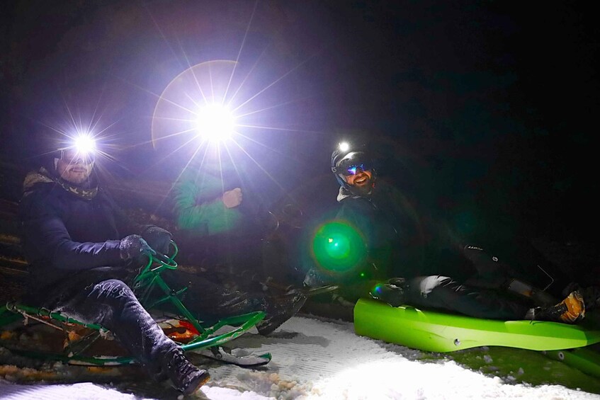 Participants are required to bring warm winter clothes, with waterproof trousers recommended. Goggles and helmets can be brought along, although they are not necessary. The price includes sled rental, helmet, headlamp and goggles rental, and a 1-hour skipass for the sled run.
