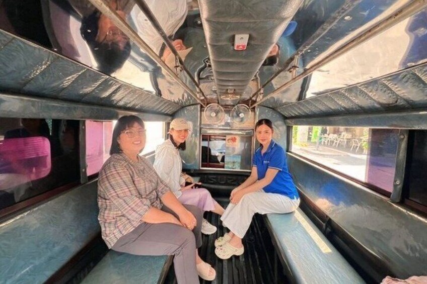 - This tour is operated with a typical Thai “songthaew”. A songthaew is a converted pick-up truck with two benches in the back, open sides, and no air-conditioning. It’s an authentic way locals travel around Chiang Mai.