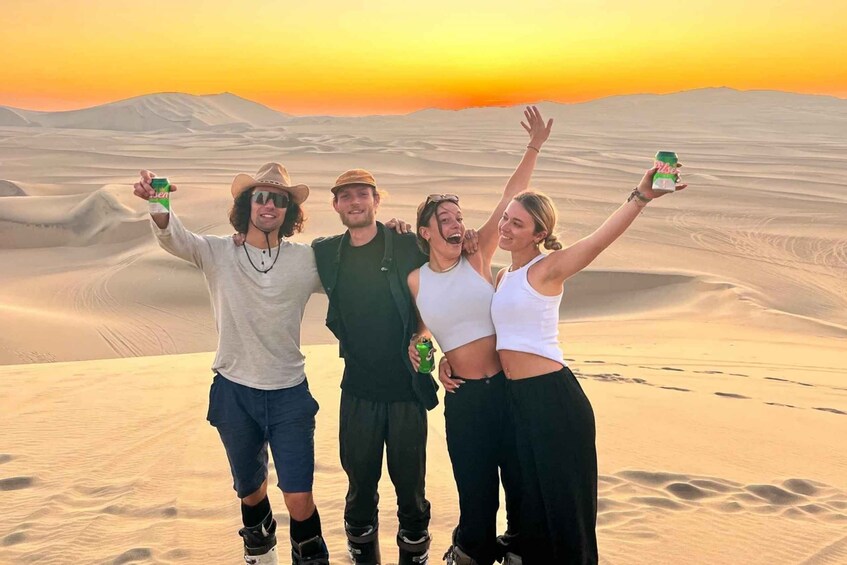 At approximately 4:00 - 5:00 am, we will pick you up at your hotel, located in Miraflores or San Isidro. Our first destination will be the impressive Ballestas Islands. Then, we will head to the vineyard, where we will enjoy a delicious lunch. Afterwards, we will visit Huacachina, where we will take a guided tour that includes tubing and sandboarding. At the end of this exciting experience, we will return to Lima, with an estimated time of arrival at 22:30.
