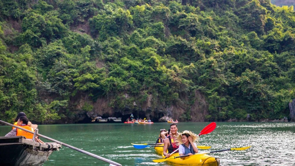 As the sun sets, return to the boat for a sunset party with happy hour deals and a traditional Vietnamese cooking class on the sundeck. After a delightful dinner, relax at the bar or try your hand at squid fishing. The second day begins with a light breakfast and a visit to Luon Cave, where you can choose between a bamboo boat ride or kayaking. Conclude your trip with a farewell lunch as the boat cruises back to the harbor, leaving you with unforgettable memories of Ha Long Bay.