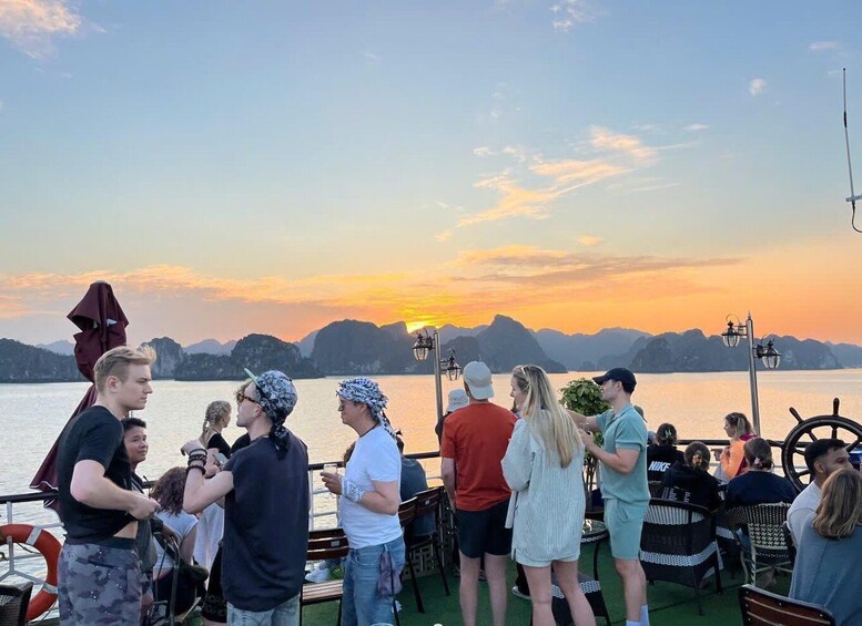 • Sunset party: red wine, light foods, fruits in Halong Bay UNESCO World Heritage