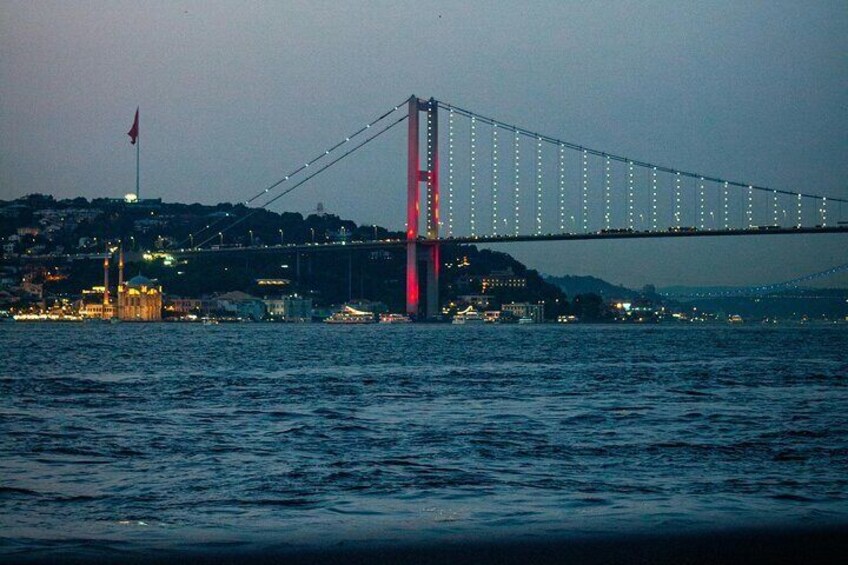 Pass under the iconic suspension bridge that connects two continents. At night, its colorful lights create a spectacular photo opportunity.