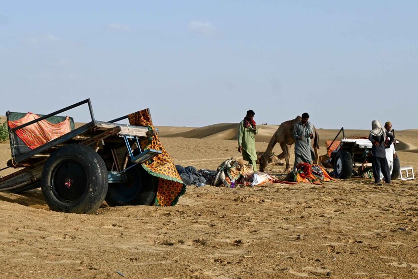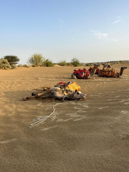Enjoy a camel ride through the Sam Sand Dunes as the sun sets over the Thar Desert.