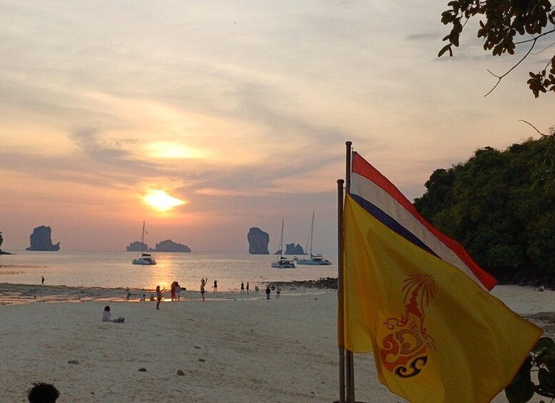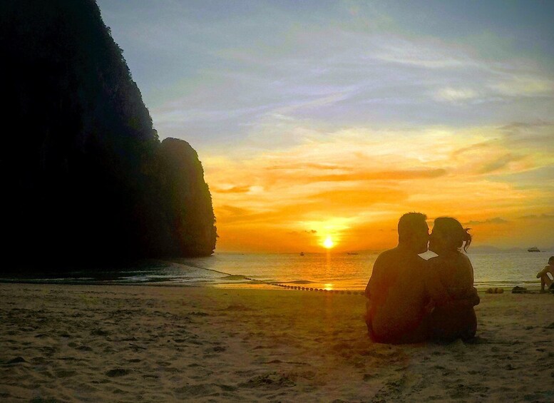 As the afternoon transitions into evening, the atmosphere becomes calm and romantic. Guests can relax on the boat, enjoy the sea breeze, and take memorable couple photos with assistance from the guide using their own cameras or phones as the sun sets over the Andaman Sea.
