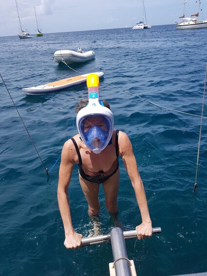 Around noon, we head to our second site, typically behind Bourg des Anses d'Arlet, where you can enjoy a picnic or opt for the full meal offered onboard the catamaran (extra fee). Our meal includes appetizer, first dish, main course, dessert, coffee, and drinks. We serve a BBQ with grilled fish (usually tuna) or chicken and offer vegetarian, vegan, gluten-free, and dairy-free options. Feel free to bring your own picnic if preferred.