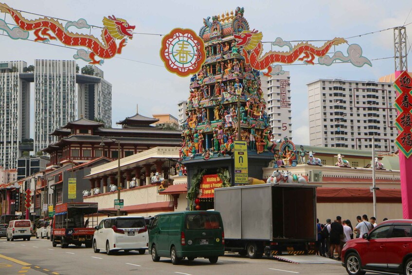 The journey begins in Little India, where vibrant streets are lined with spice shops, flower garlands, and colorful shophouses. As you walk through the neighborhood, you will notice striking street murals tucked along side lanes and building walls, illustrating scenes of early migrants, traditional trades, and daily life. These artworks add a contemporary creative layer to the area’s deep-rooted heritage, turning ordinary streets into open-air galleries. Cultural highlights include a visit to Sri Veeramakaliamman Temple and a photo stop at the brightly painted House of Tan Teng Niah, offering visual context to the neighborhood’s history.