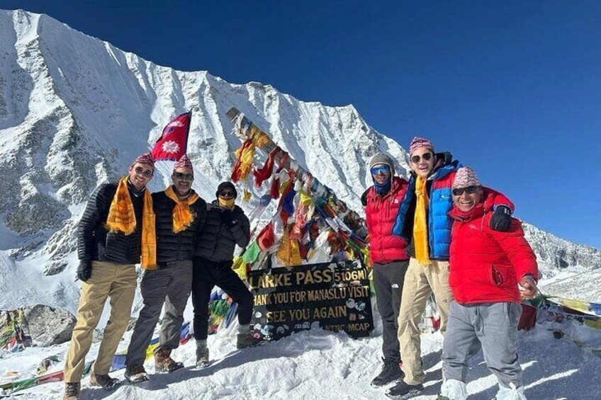 -Cross the Larke La Pass at 5160 meters with breathtaking views of Manaslu and the surrounding snowy mountainscape and peaks like Himalchuli and Himlung Himal.