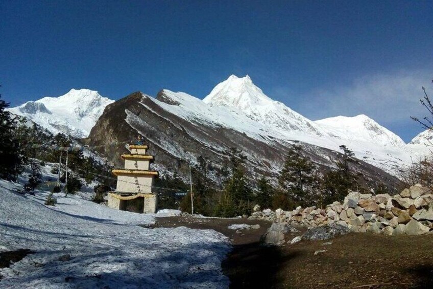 From Namrung, day 7 trek is a 4 to 5-hour hike to Lho. This day you will cross the 3000-meter mark and the maximum altitude reached on this day is 3180m. You may begin to feel more tired as you walk. However, as long as you walk ona constant pace, you will reach Lho fairly easily as it is relatively a short trek. Beautiful stone walls and prayer flags will welcome you to Lho. At Lho, you have an iconic view of Manaslu and can visit the beautiful Ribung Monastery as you rest and acclimatize for the journey ahead. This day is a relatively short trek as you walk for around 11 kilometers only.