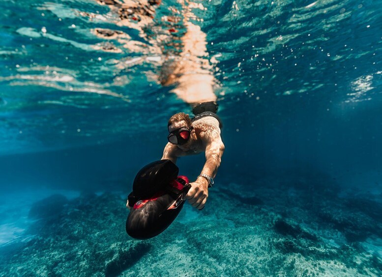 Enjoy an exceptional experience in Martinique with our full-day underwater scooter rental. Designed for amateurs and beginners alike, this scooter lets you explore the island's underwater wonders with ease and effortlessly. Whether you want to admire the colorful reefs, observe tropical fish, or simply enjoy the unique sensation of gliding over the seabed, this activity offers you total immersion in a spectacular natural environment.