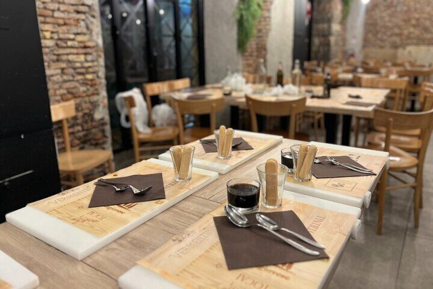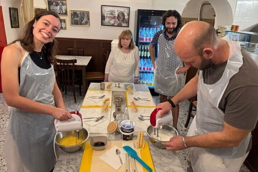 Welcome to the restaurant! Let's start by taking a look around and meeting your host and fellow classmates. You will start the lesson with a glass of prosecco, before you pop on your apron. The class itself will begin with a demonstration on how to make to perfect tiramisu cream. Once this is done, you will have the chance to construct your own. Next up is the pizza dough. Together you will make traditional Neapolitan pizza dough and prepare it for the oven. Finally it is time to take a seat at the table. You will share a meal with your new friends and another good glass of wine! Let's see how well you did on those pizza's and end the day with your own tiramisu!