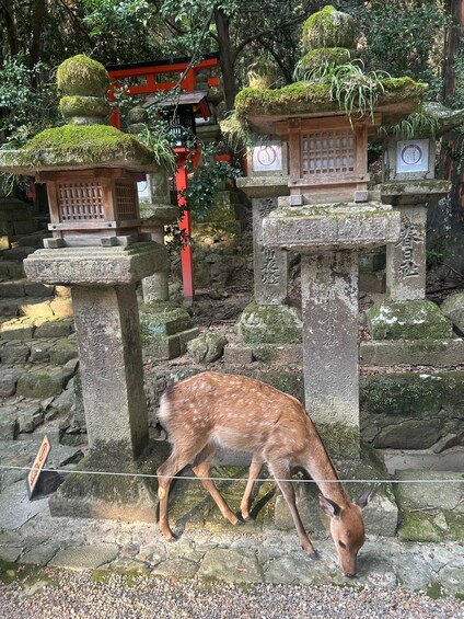Then, follow your guide on a peaceful walk along Kasuga Taisha’s lantern-lined forest paths, learning about Shinto beliefs and the shrine’s deep connection to nature.
