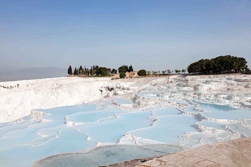 Explore Hierapolis’ well-preserved ruins, including its grand theater, necropolis, and ancient thermal baths that once welcomed Roman visitors. With the included audio guide, uncover the stories behind the city’s sacred hot springs, the Plutonium (Gate to the Underworld), and the remarkable travertine formations of Pamukkale.
