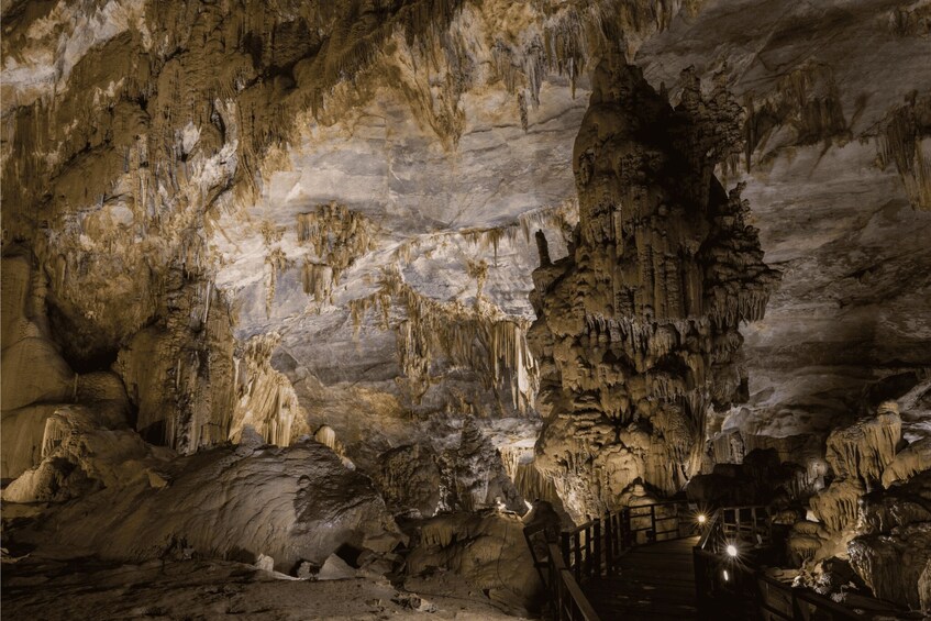 Begin exploring the first 1,000 meters along wooden staircases and boardwalks, marveling at impressive stalactites and stalagmites formed over millions of years. Continue beyond the boardwalk to venture deep into the cave with a personal flashlight, trekking over rugged terrain and cliff paths to discover colorful and uniquely shaped limestone formations.