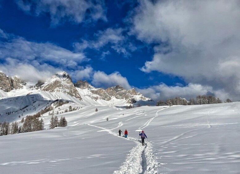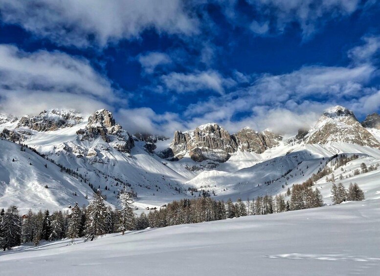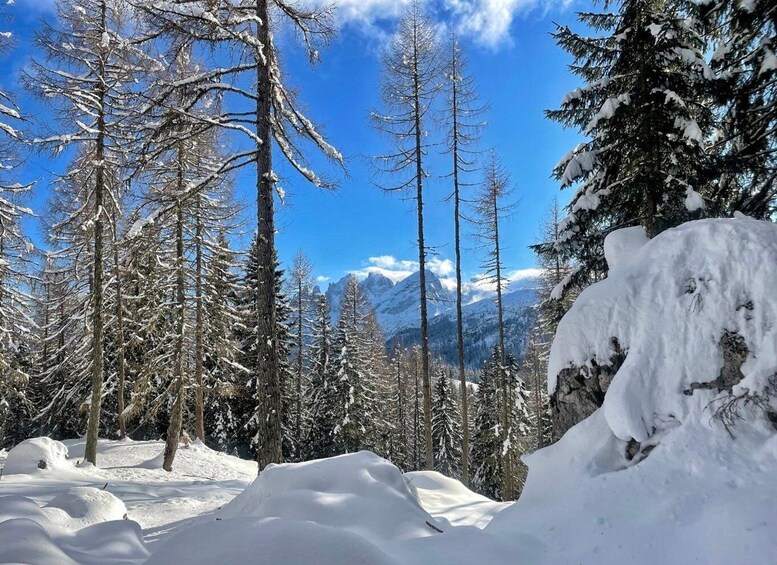 The route adapts to the snow conditions and the needs of the group, alternating open spaces with sparse woodland sections. As you climb, the view opens up to the Pale di San Martino to the south and the peaks of the Marmolada to the north, offering spectacular views of the Dolomites, a UNESCO World Natural Heritage Site.