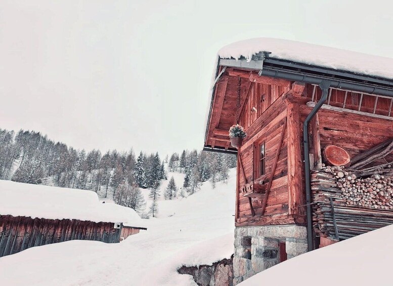 You'll walk with snowshoes on wide slopes covered with a soft white blanket, among the characteristic wooden tabià that dot the basin and preserve the authentic atmosphere of the high-altitude mountain pasture.