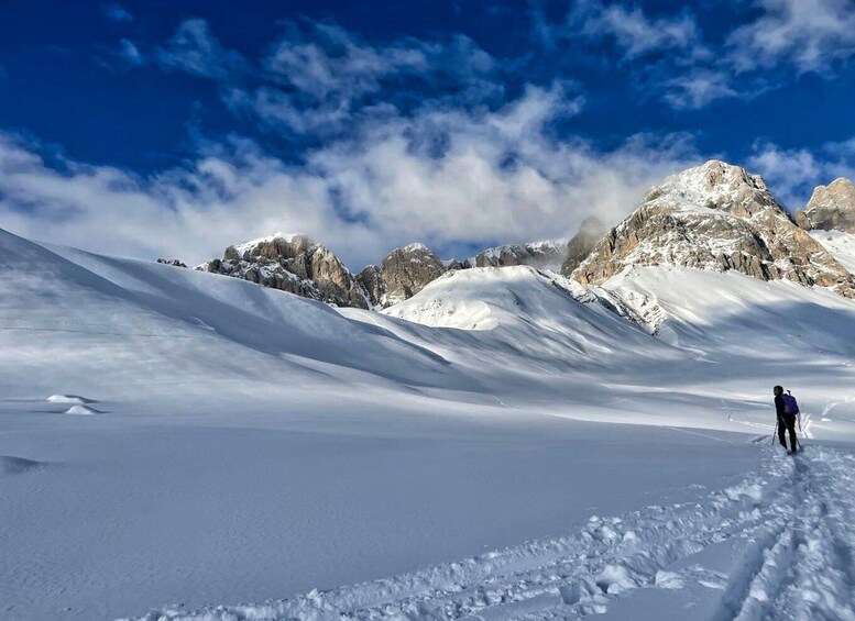 Discover the extraordinary beauty of the Fuciade basin, just beyond the San Pellegrino Pass, between Trentino and Veneto. Join a guided snow hike with a certified local guide, immersed in a Dolomite landscape of rare beauty.