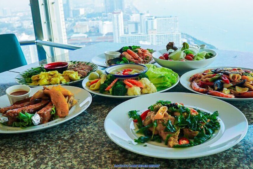 Dine with sunset-to-night views at the revolving restaurant (floors 52–54). Thai & global buffet—perfect after a park day.