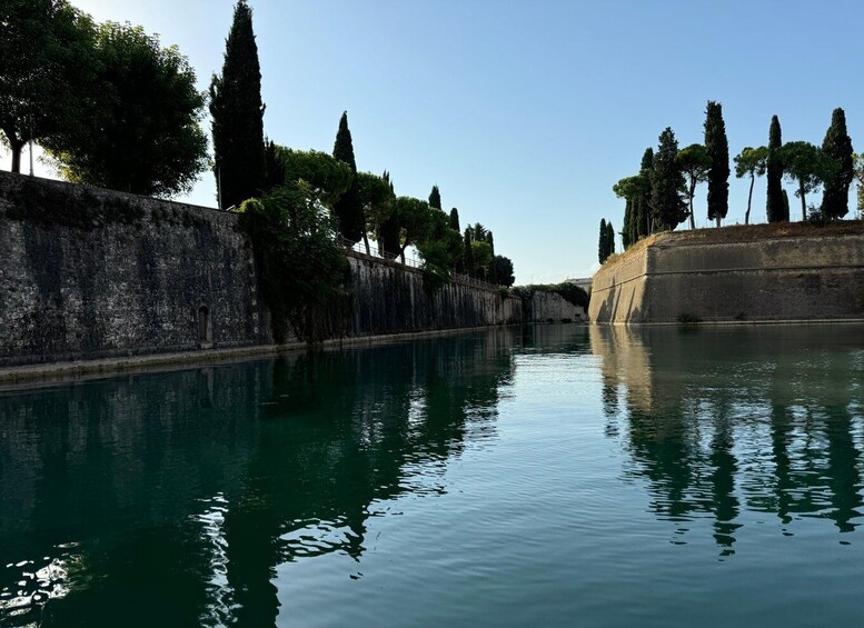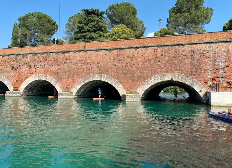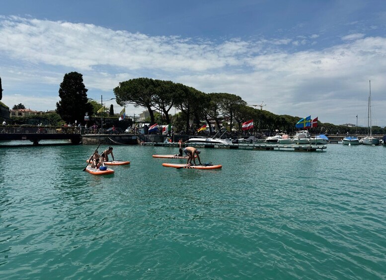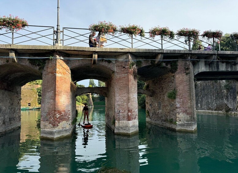 A unique experience discovering an ancient village surrounded by canals overlooking Lake Garda. A sightseeing tour paddling on a SUP to discover an ancient village surrounded by canals overlooking Lake Garda. A unique experience in nature, admiring the village from a different perspective. The activity and route will be easy, paddling through the village's canals, passing under bridges like in Venice. A gondola will be visible during the activity. Along the route, you can take photos or videos with a stop on Isola Terrai. For participants who are not in a hurry, it will be possible to have an aperitif at the bars located along the main canal. With the assigned instructor, you can customize your experience for more time or a longer stop to enjoy the magic of the sunset in one of the many bars located on the main canal of the village. A cap, sunglasses, and a waterproof bag will be provided free of charge to keep your documents and other items dry. We recommend arriving at the location 10 minutes before the activity. If you are arriving from another town on Lake Garda, you can take the ferry directly to the port of Peschiera del Garda. The meeting point is about 2 km from the port. For those arriving by car, there is convenient parking along the road or directly at the port.