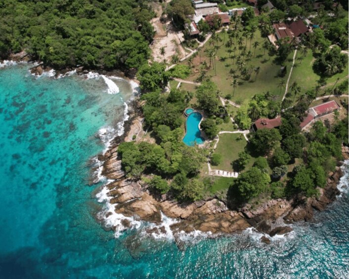 Coral Island lies just off Phuket's southern coast. It is renowned for its turquoise sea, soft sandy beaches, and the vibrant coral reefs that surround its shores, creating a truly picturesque tropical view.