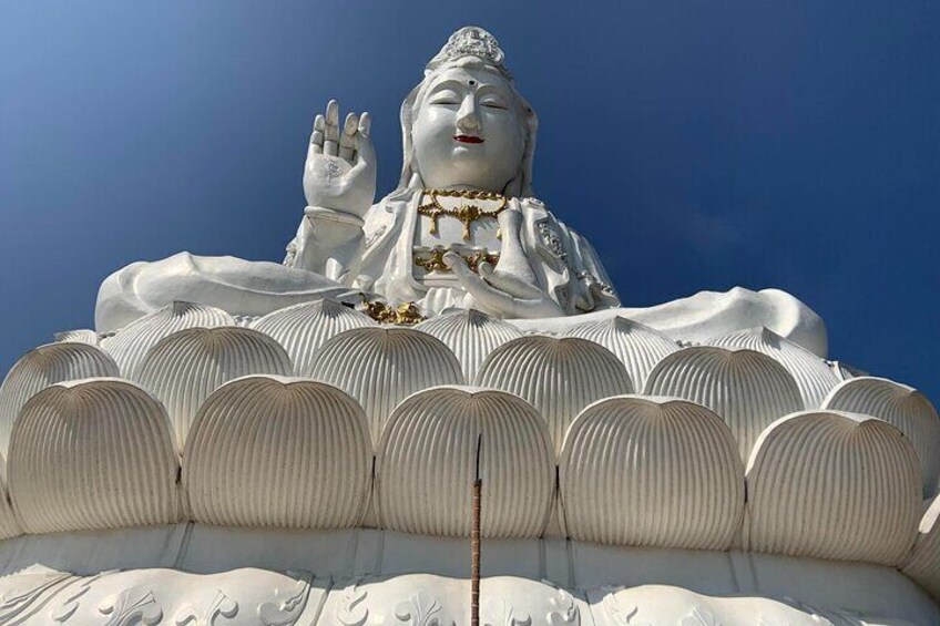 An elegant Goddess of mercy on a hill. It is the Chinese Buddhist Temple. Beautiful with high scenery and amazing art in the temple.