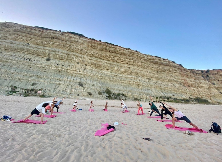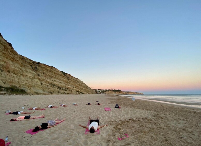 We are starting our class with a little walk to a more hidden spot at Praia de Porto Mós, surrounded with an amazing cliff and a view over the ocean. This is a nice way to get ready for our beautiful Yoga session watching the sunset over the beach. The class is a Hatha Yoga-based class that is open to all levels of practice, beginner to advanced. When the sun is setting, there is a magical feeling in the air, the light is changing and another small cycle closes after a busy day. This is the perfect time to practice and remind yourself of the journey of letting go. Come and join us and enjoy the wind in your hair, the sun on your face, the sound of the waves and the smell of the fresh ocean.
