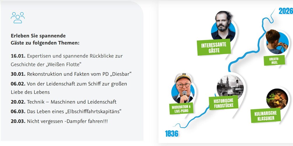 On board the modern MS “August der Starke” salon ship, technology, history, and lively storytelling meet: presenter Dirk Ebersbach guides you through the exciting development of our last 190 years in a multimedia and interactive way.